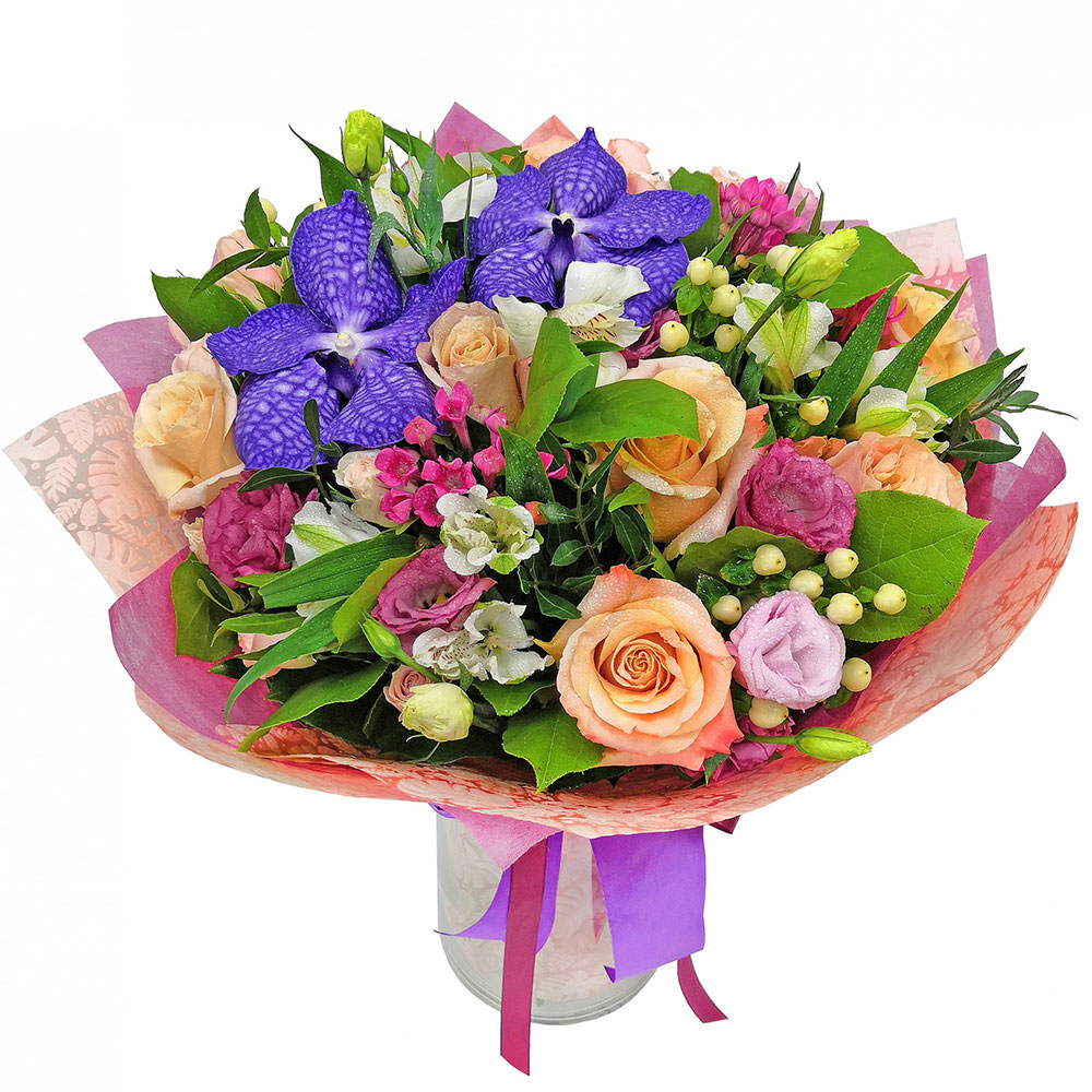 На фото представлен образец. Объем букета зависит от выбранного вами размера. Точное количество цветов и цветовую гамму вы можете уточнить у менеджера по телефону.