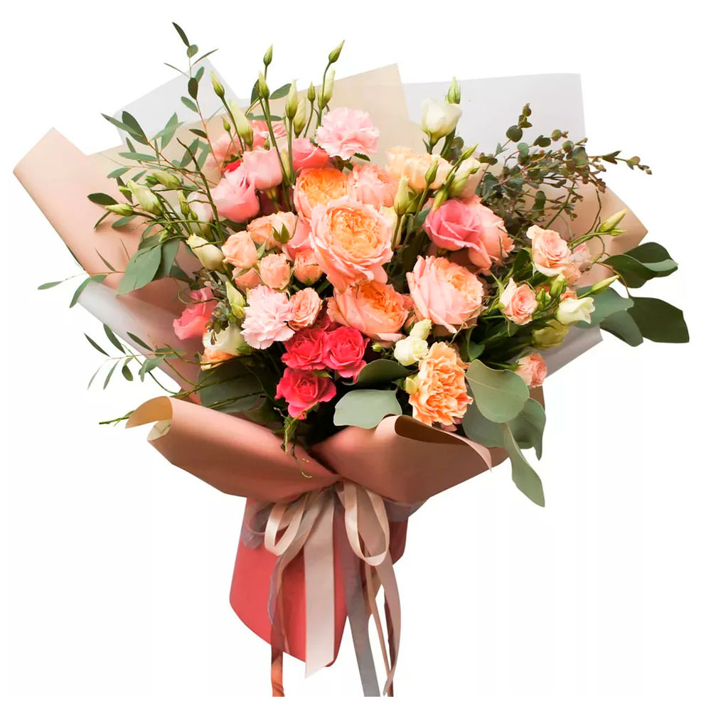 На фото представлен образец. Объем букета зависит от выбранного вами размера. Точное количество цветов и цветовую гамму вы можете уточнить у менеджера по телефону.