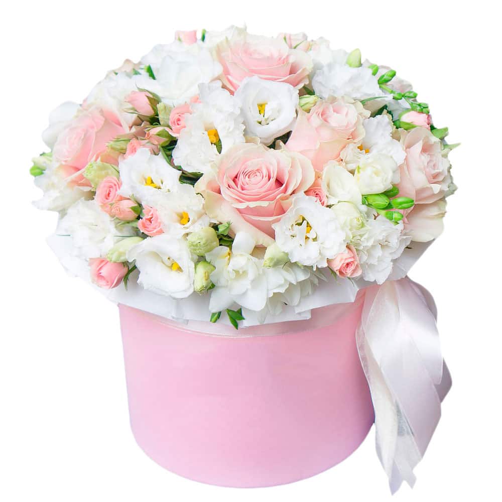 На фото представлен образец. Объем коробки зависит от выбранного вами размера. Точное количество цветов и цветовую гамму вы можете уточнить у менеджера по телефону.